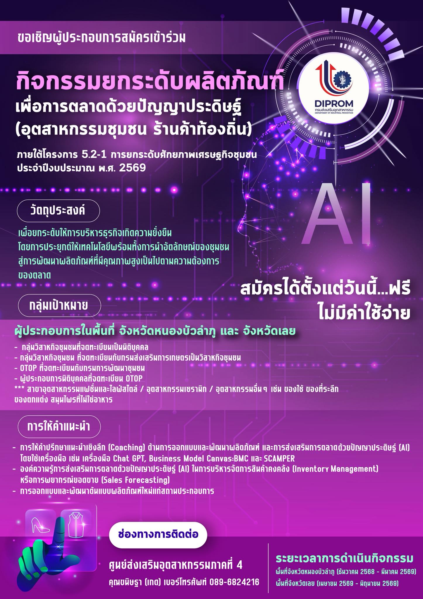 ศูนย์ส่งเสริมอุตสาหกรรมภาคที่ 4 กรมส่งเสริมอุตสาหกรรม เปิดรับสมัครผู้ประกอบการเข้าร่วมกิจกรรม “การยกระดับผลิตภัณฑ์เพื่อการตลาดด้วยปัญญาประดิษฐ์ (AI)” ภายใต้โครงการ 5.2-1 เพื่อเสริมสร้างศักยภาพเศรษฐกิจฐานรากอย่างยั่งยืน ประจำปีงบประมาณ พ.ศ. 2569
